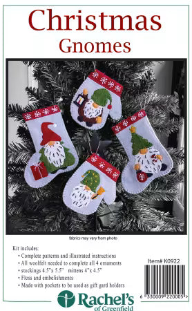 Christmas Gnomes Kit includes all woolfelt, floss, and templates needed to complete all 4 ornaments. Mittens measure approximately 4”x 4.5” and sto...