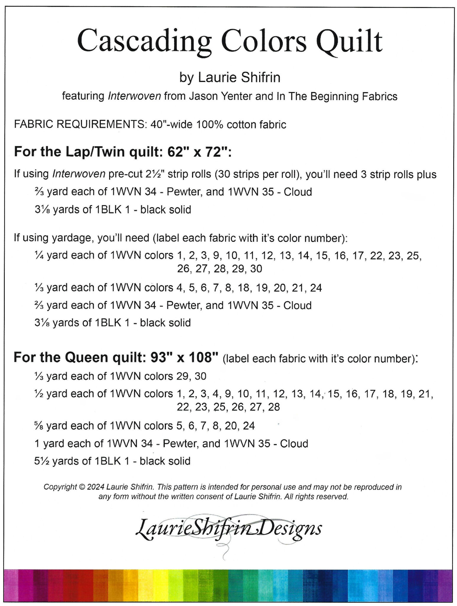 Cascading Colors is a gorgeous quilt pattern designed by Laurie Shifrin. Featuring the Interwoven fabric collection from In The Beginning, this striking quilt is easy to assemble using precut 2.5" strips (or 3.5" strips for the queen size).