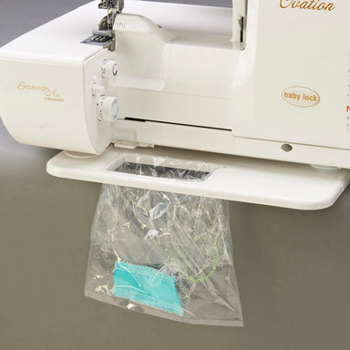 Use this trim bin to keep your sewing area tidy. It catches cut fibers as you serge. Fits all Baby Lock serger models.