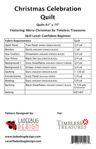Christmas Celebration Quilt Pattern from Ladeebug Designs features Timeless Treasures' Merry Christmas collection. Finished size: 61" x 75". Beginn...