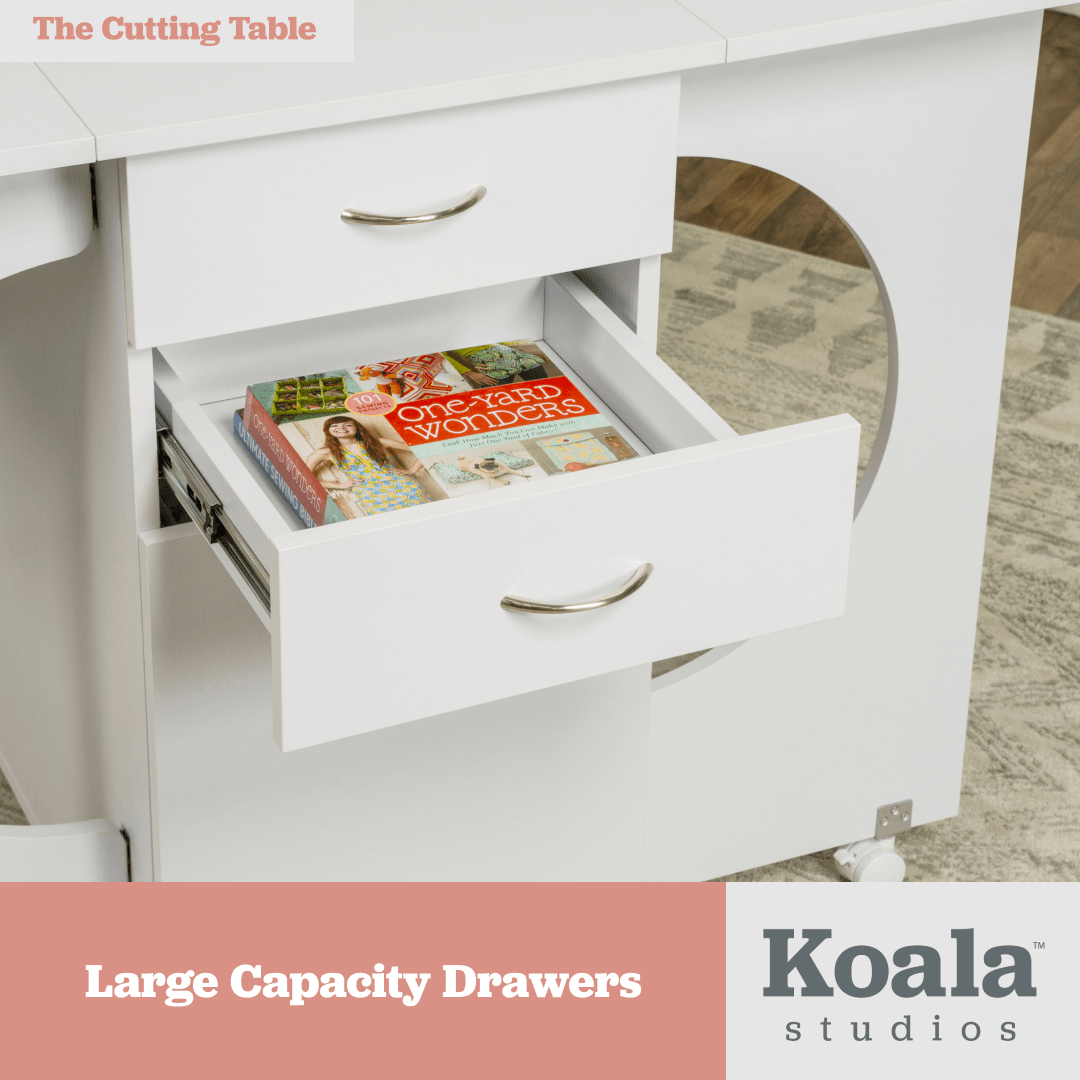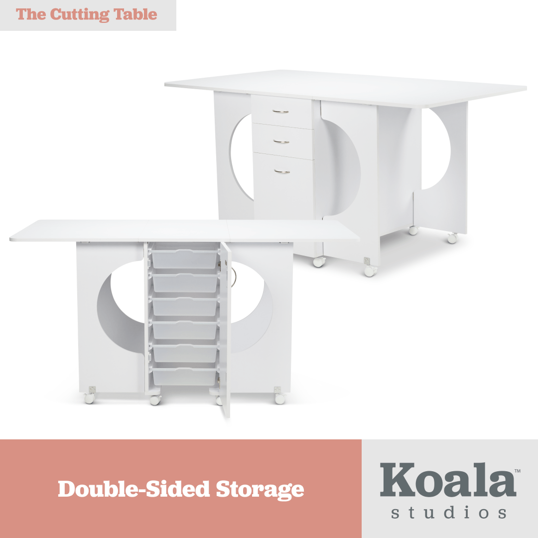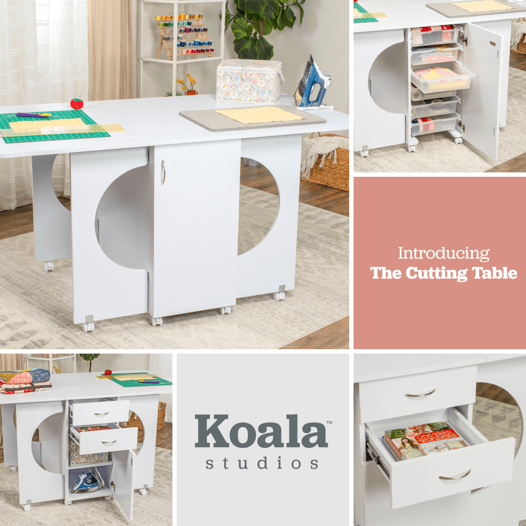 Every sewing space deserves a dedicated cutting station, and the Koala Cutting Table is one of the finest available. Designed for efficiency and versatility, it features double-sided surface extensions, two concealed shelves, two drawers, six slid-out storage bins, and smooth-rolling casters for effortless mobility. Whether you're quilting, crafting, or sewing, this cutting table is the ultimate workspace upgrade.