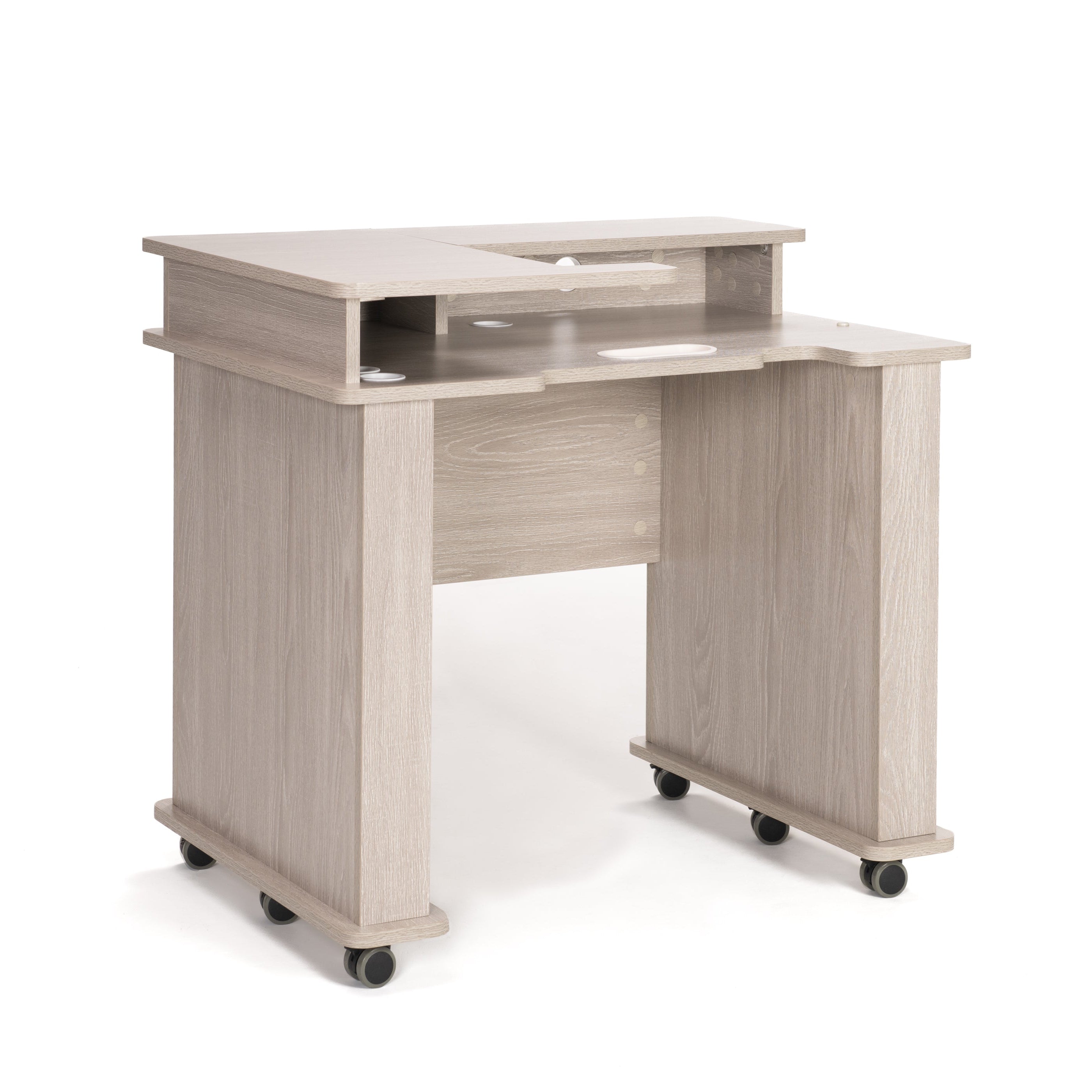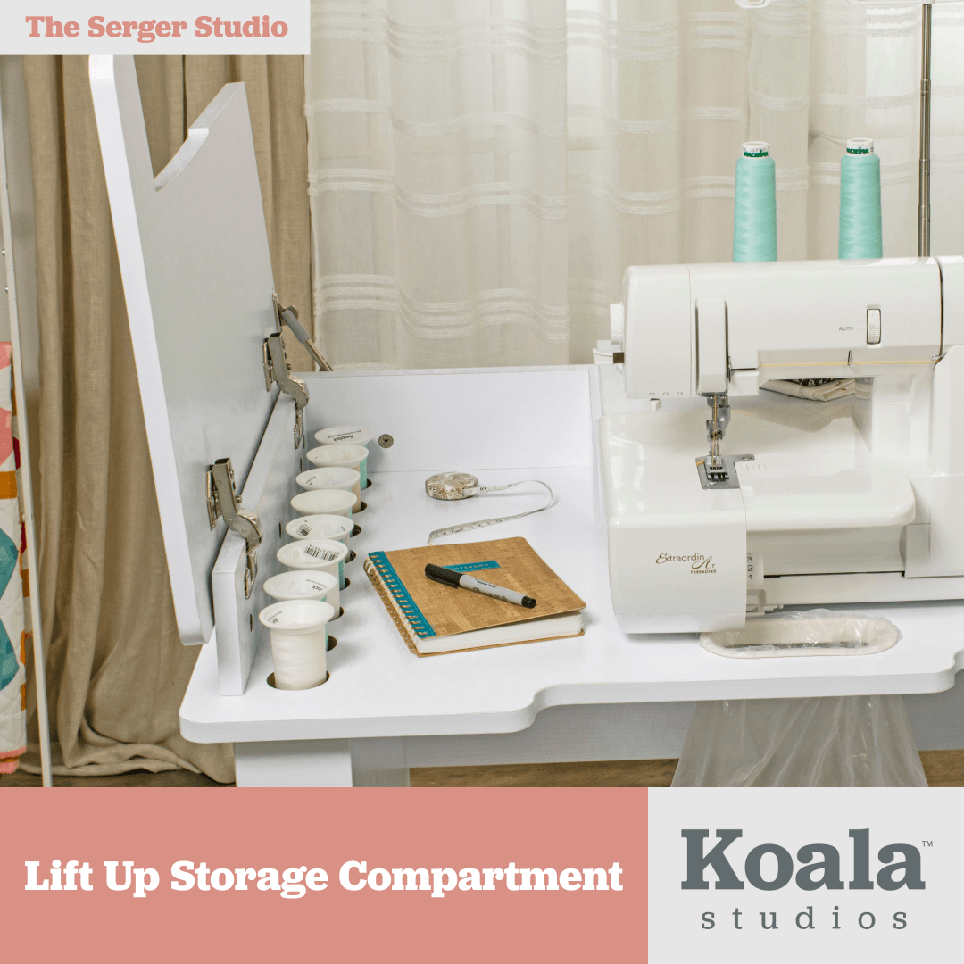 Sewing room organization is easy with the Serger Studio. The ideal place for your machine and serging supplies, this luxurious serger cabinet includes a lift-up storage compartment with soft-close hinges for thread, magnetic pins, notions, and more. It’s truly a must-have for your dream sewing studio, crafted with the finest materials for lasting elegance.